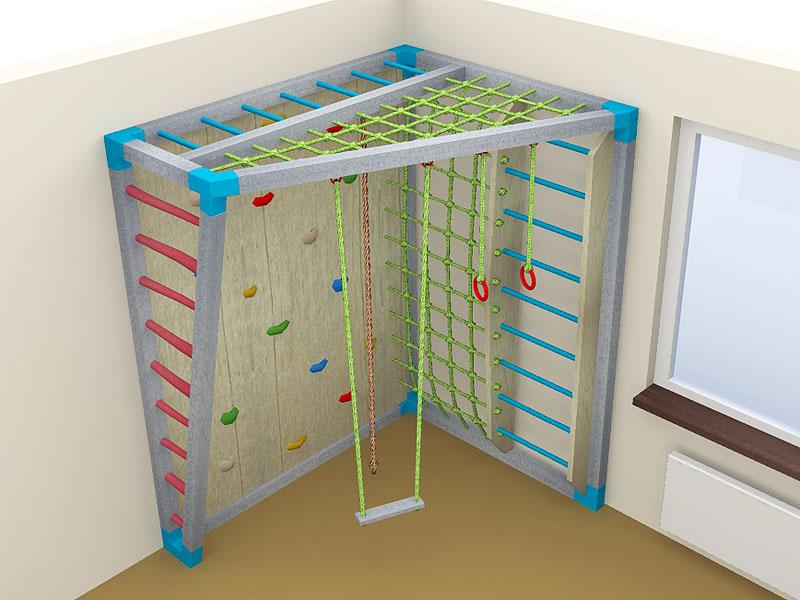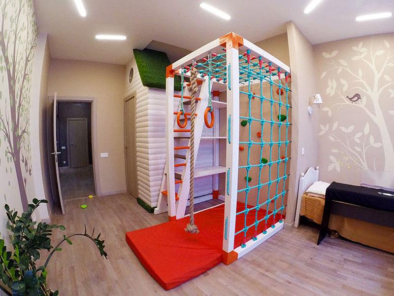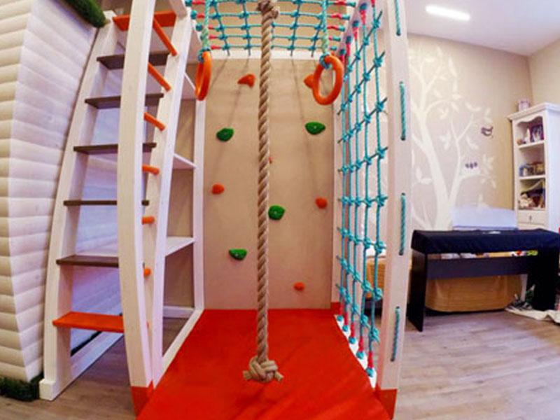 Детские площадки для квартиры могут быть похожи на лаконичный гимнастический зал или вольер для мартышек… Если надо, то потолок будет небом, а паркет газоном. Воображайте дорогие взрослые, оглядывая пока еще пустую комнату, предназначенную для детской. Полистайте журналы, загляните в интернет, посетите зоопарк… Потом звоните нам. Уж мы то развернемся на славу.